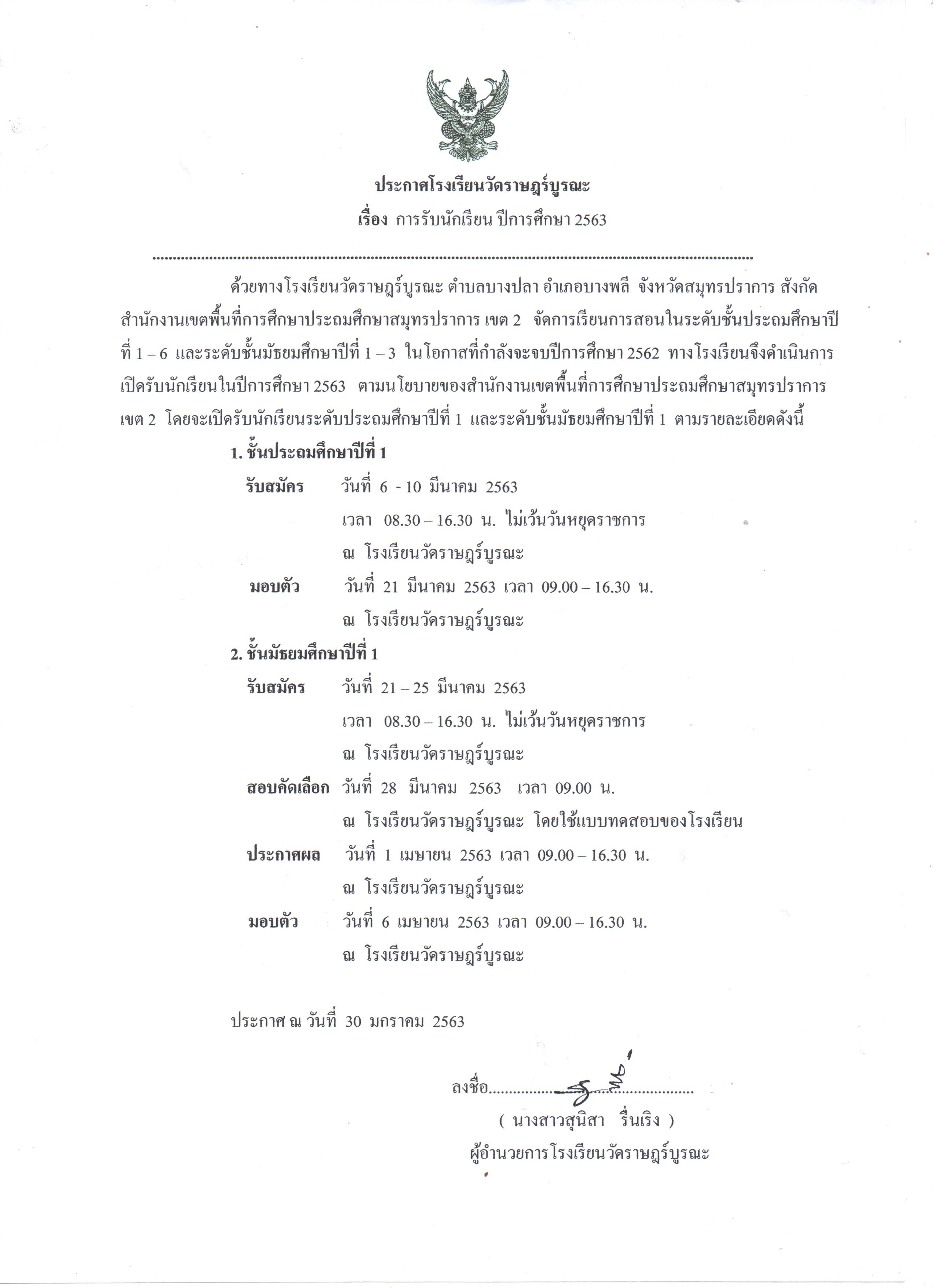 ประกาศรับสมัครนักเรียนชั้นประถมศึกษาปีที่ 1 และนักเรียนชั้นมัธยมศึกษาปีที่ 1